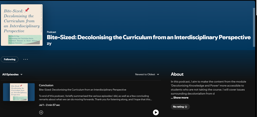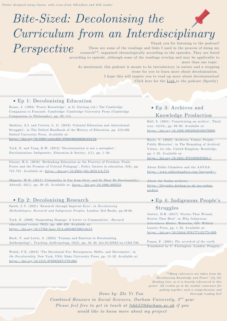So, here’s the podcast titled “Bite-sized: Decolonising the Curriculum from an Interdisciplinary Perspective”, which is on Spotify. It is publicly accessible, along with an information poster I made with some extra references and resources. The poster link is attached in the ‘Description’ section for each episode.